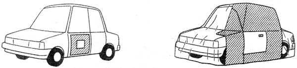 實(shí)際維修工作中所要遮蔽區(qū)域面積的大小,與所用的噴涂方法、噴槍的走槍方式、漆霧的散射范圍等都有密切關(guān)系,另外點(diǎn)修補(bǔ)噴涂和塊修補(bǔ)噴涂所用的遮蔽方法也不相同。因此,實(shí)際遮蔽工作中必須根據(jù)情況確定恰當(dāng)?shù)恼谏w范圍,盡量保證在每一種情況下遮蔽的面積最小(如右圖4-3-2)。